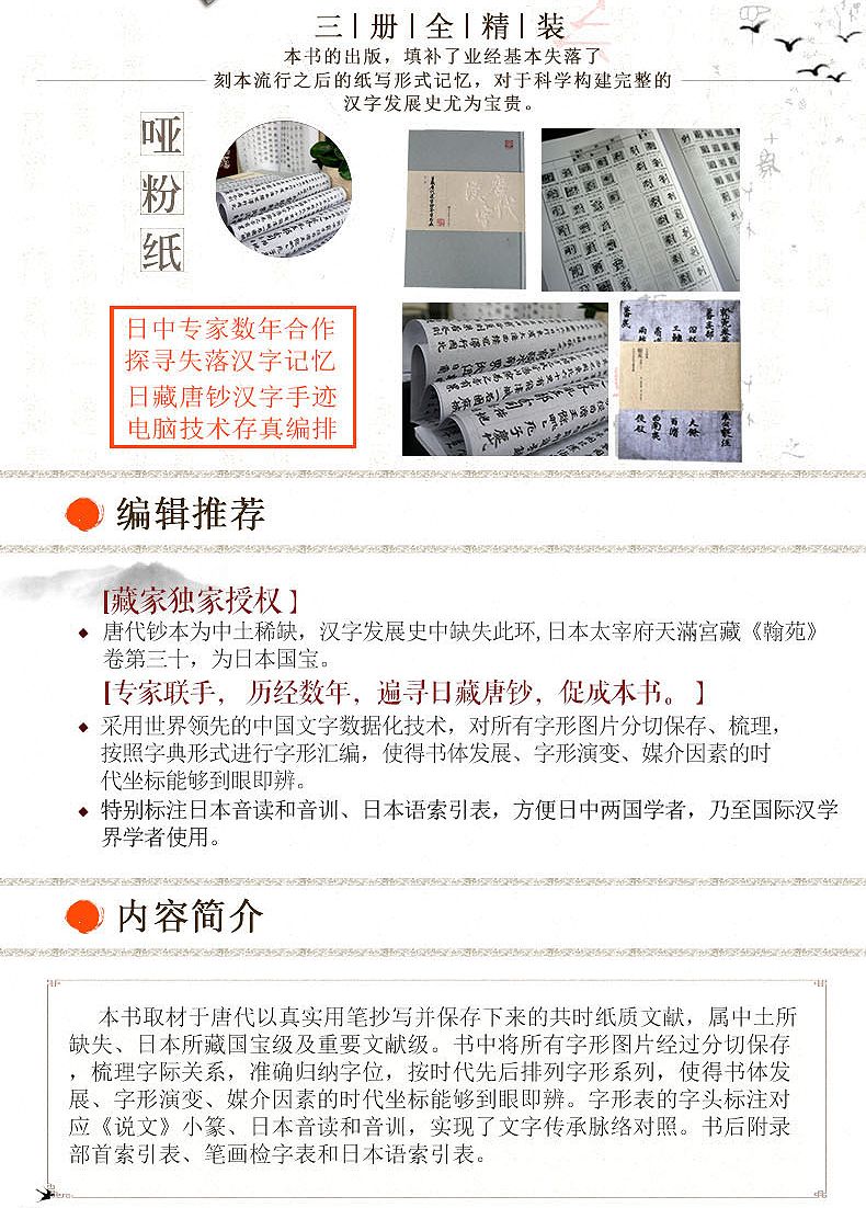 唐代に毛筆によって書き写された文献をもとに、日中の学者が共同で編纂したもの。日本所蔵の唐代文献は、中国ではすでに失われ、日本において国宝および重要文献とされている。編纂にあたり、文献を電子データ化し、一字ずつ確認し、時代順に字形を配列した。それにより書体の発展、字形の変遷、媒介要素などを視覚的にとらえることを可能としている。字形表の頭字は『説文解字』小篆と対応しており、注釈では日本語の音訓についても言及する。巻末には部首索引、筆画索引、日本語索引を附す。