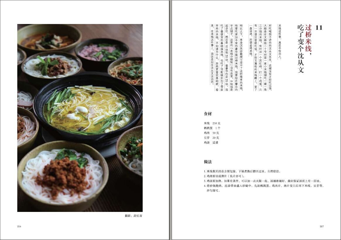 民国期の文人が愛した「食」をテーマに、張愛玲、張大千、呉宓、黄侃、銭鍾書、張恨水など20余名の食にまつわるエッセイをイラストとともに収録。さらに彼らが好んだ料理を、美しい写真と文章、レシピを添えて紹介する。 牛肉麺、葱花蛋、紅焼排骨、窩頭、過橋米線、紅焼肉など庶民的な料理をはじめ、チョコレートやコーヒー、クロワッサンといった西洋の香りが漂うものまで、ゆったりとした繊細な語りで文人達の「食」へのこだわりを綴っており、彼らの真実の姿が生き生きと描き出されている。