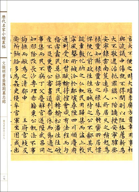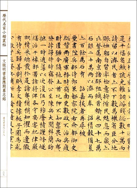 据《中国人名大辞典》记载,盛应期,字思征。明弘治进士,授都水主事,累官右副都御史。巡抚四川,改抚江西。奏免杂赋,积谷备荒,人民德之。明嘉靖十四年病故家中。文徵明为其撰并书近二千言的墓志铭。这件长卷中,文徵明饱含深情,赞扬盛公为官一任,造福一方的事迹。这件珍迹现藏于广东省博物馆,其规格为高十八点八厘米,横二百四十九点五厘米。