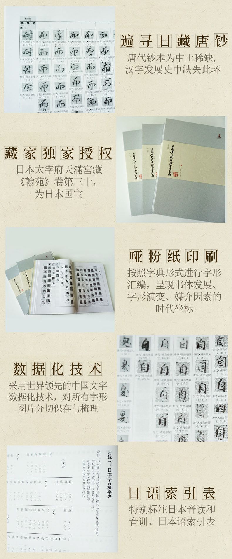 唐代に毛筆によって書き写された文献をもとに、日中の学者が共同で編纂したもの。日本所蔵の唐代文献は、中国ではすでに失われ、日本において国宝および重要文献とされている。編纂にあたり、文献を電子データ化し、一字ずつ確認し、時代順に字形を配列した。それにより書体の発展、字形の変遷、媒介要素などを視覚的にとらえることを可能としている。字形表の頭字は『説文解字』小篆と対応しており、注釈では日本語の音訓についても言及する。巻末には部首索引、筆画索引、日本語索引を附す。