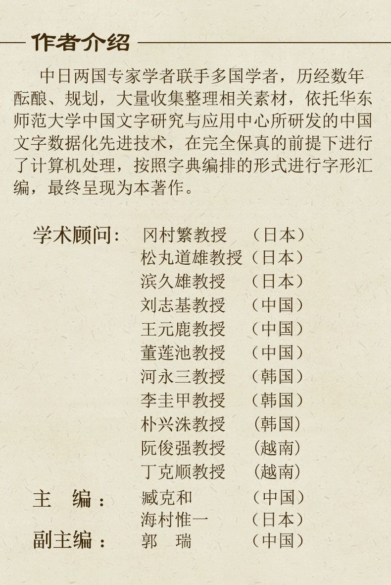 目錄: 凡例說明 正文 附錄一:部首索引 附錄二:筆劃檢字表 附錄三:日本字音檢字表 附錄四:本書所用文獻異體字對照表 附錄五:部分形體差異部件對照表