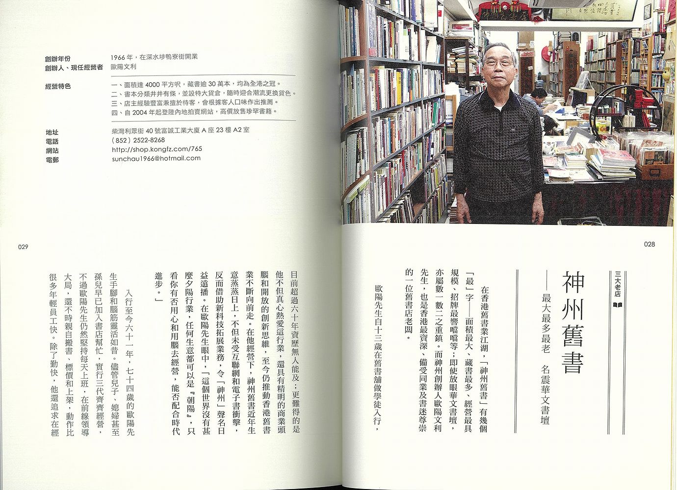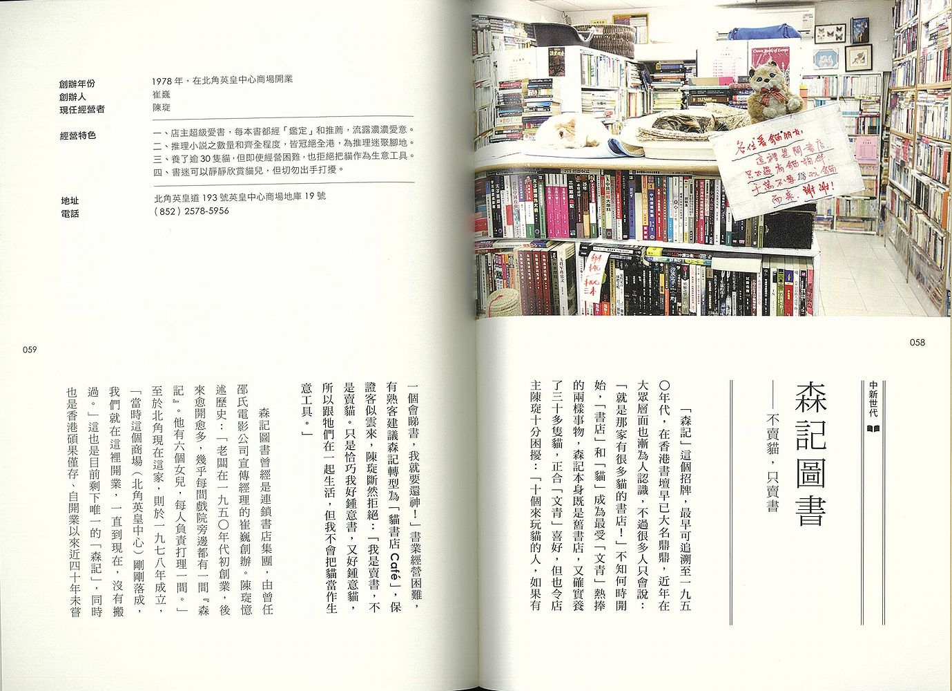 香港古本屋ガイドブック。香港の古本好きならだれもが知っている三大老舗古本屋、地域密着型の古本屋、80後世代の若者が開いた新しいタイプの古本屋、洋書専門店、車いすでも気軽に入れるバリアフリーの古本屋、シャッター街の空き店舗を活用した古本屋などなど、香港の個性豊かな古本屋15店を丁寧に紹介。 また附録として香港の著名な文化人であり、愛書家でもある小思と董橋へのインタビュー、香港古本業界の歴史を記した『香港舊書業簡史』、古本屋ではないけど古本が買えるお店のリスト『補遺:二十六個有舊書賣的地方』、本についての本の目録『關於書店的書』を後半部分に収める。 表紙絵『香港舊書店招牌群像』の作者は香港在住経験のある日本人アーティスト、山口潔子。