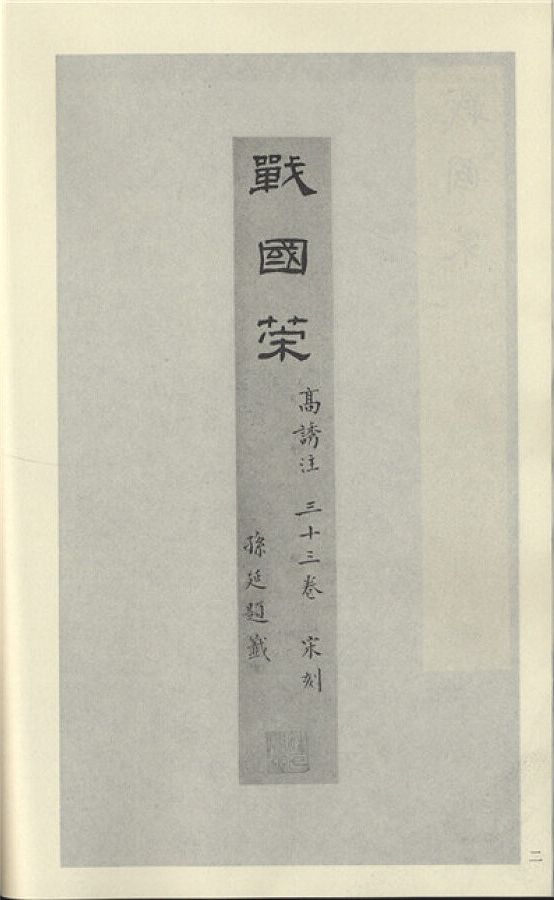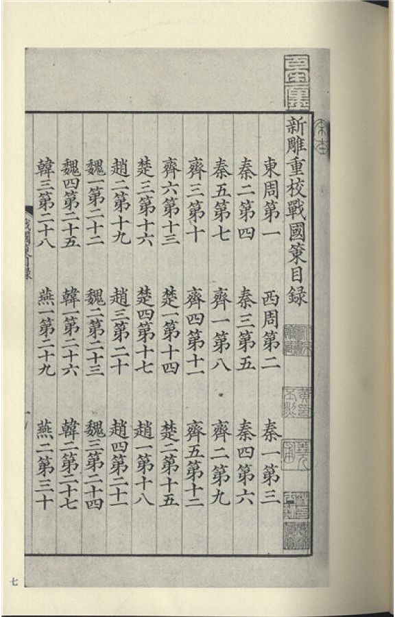 目錄: 第一冊 新雕重校戰國策目錄 卷一 東周 卷二 西周 卷三 秦一 卷四 秦二 卷五 秦三 卷六 秦四 卷七 秦五 卷八 齊一 卷九 齊二 卷十 齊三 卷十 一齊四