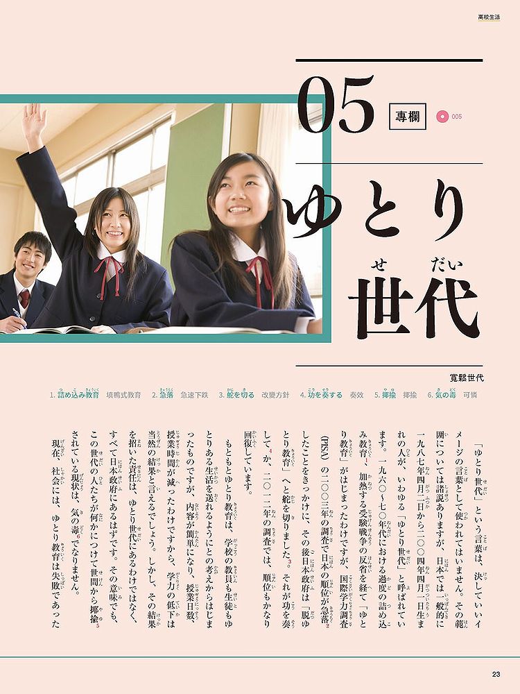 Session1 學校教育 高校生活: 文武雙全、考大學 [專欄] 寬鬆世代 大學課外生活: 打工、學園祭 [專欄] 應屆畢業生集體採用 大學學業生活: 選社團、大學的學分 [討論] 讀大學是必要的嗎?