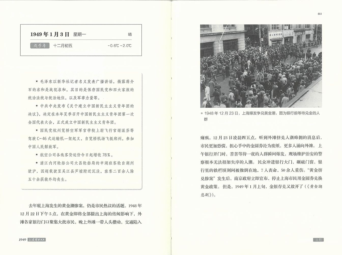 本書は1949年1月1日から1949年5月27日に上海解放が完了するまでの大事記とエピソードを、多くの写真・図像史料とともに記述する。上海解放に至るまでの街と人々の熱気が体現できるような構成となっている。