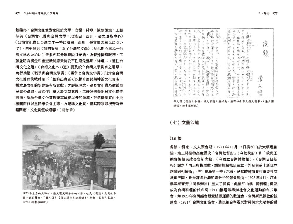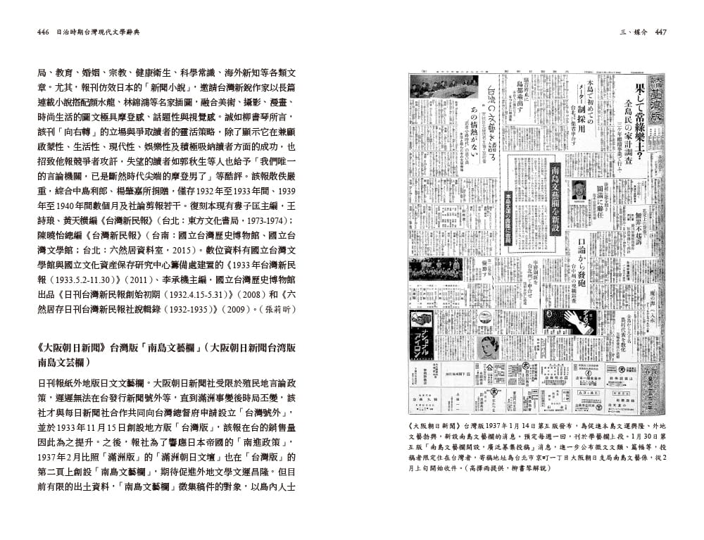 国内外の台湾文学研究者が総力を結集し、最新の知見を盛り込んで編纂した辞典。作家、作品、媒介(メディア)、思潮・運動という4つの側面から、日本統治時期の台湾文芸運動を解説。純文学のみならず、民間文学、戯劇、流行歌なども扱う。また日本、中国、「満洲国」など、台湾以外の地域における台湾文学の翻訳、出版、流通状況も明らかにしている。執筆者数128名、項目数411条、文字数28万余、画像資料数206点。
