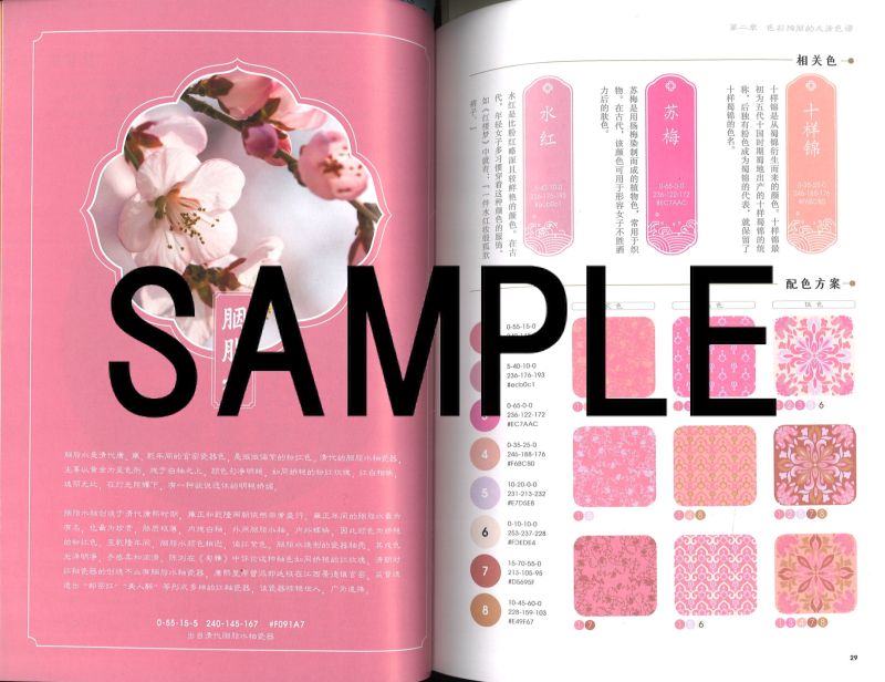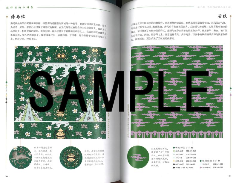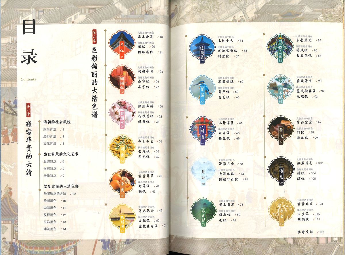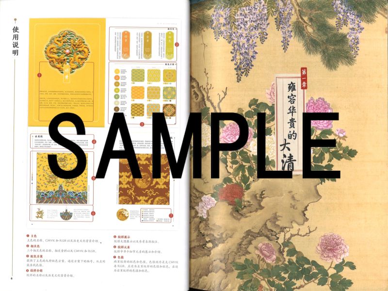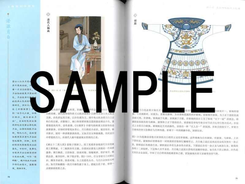 「国色大清」は、中国歴代の王朝それぞれに特有の伝統色彩について、一冊一王朝ごとに読み解くカラー図冊シリーズの一冊。シリーズは唐・宋・明・清の四冊が刊行される。 本書の第一章は清朝色彩の概説。清朝の政治・経済・文化の背景を概述し、次いで清朝の服飾・書画・器物の特徴を解説した上で、清朝の絵画・磁器・紋様・服飾・建築に用いられる色彩について解説する。 第二章では、朱紅・珊瑚紅・明黄・瑠璃黄・瑠璃藍・翠藍・赤金など清代に特徴的な16種の色彩ごとに詳しく解説する。 各色の解説は、まず主色の名称、CMYKおよびRGBカラーモデルを記載し、相関色3種(たとえば主色が朱紅なら相関色は赫赤・朱桜・洛神珠の3色)の名称とCMYKおよびRGBカラーモデルを記載。9種の配色例、代表的な紋様の図版と解説、などによって構成される。
