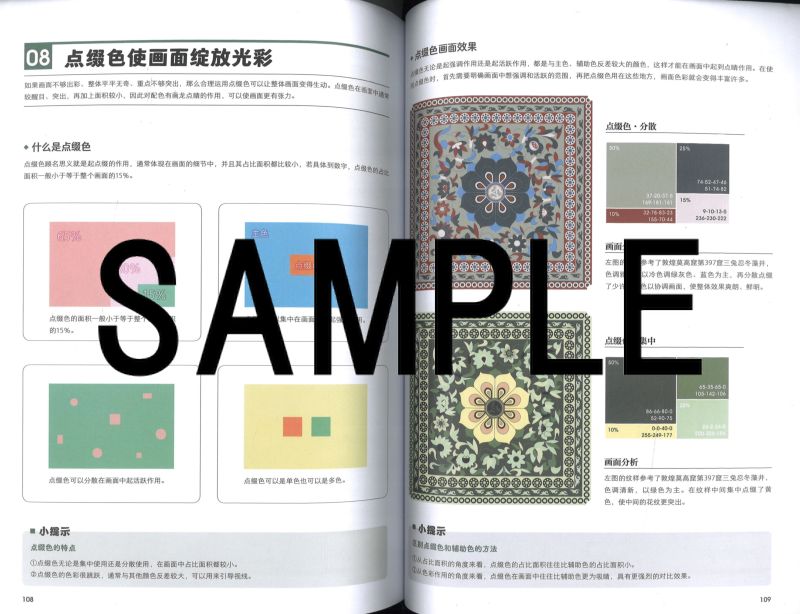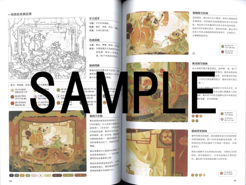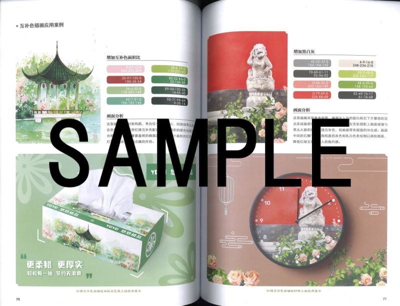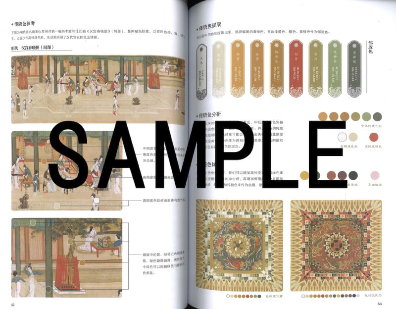 本書は、中国の伝統的色彩や紋様を、家具や食器などの日用品やビジネス用品まで、現代のさまざまな社会生活の場において用いられる品の装飾デザインとして再現するための実践的な手引書。 スタイルの事例から実際の応用まで、タスク型の教授法を採用し、実際の制作過程をシミュレーションすることで、より職業的な応用を重視している。 伝統色の基礎知識の章では、読者が伝統色を体系的に理解できるようにし、後半の「色彩リファレンス」および具体的応用部分への土台を築く。具体的応用部分では、多様な使用シーンを取り上げ、色彩配色の応用概念や描画のアドバイスを提示する。また、色彩応用については、全体的な配色体系の枠組みを示し、配色原理を応用して理解を広げられるよう工夫している。