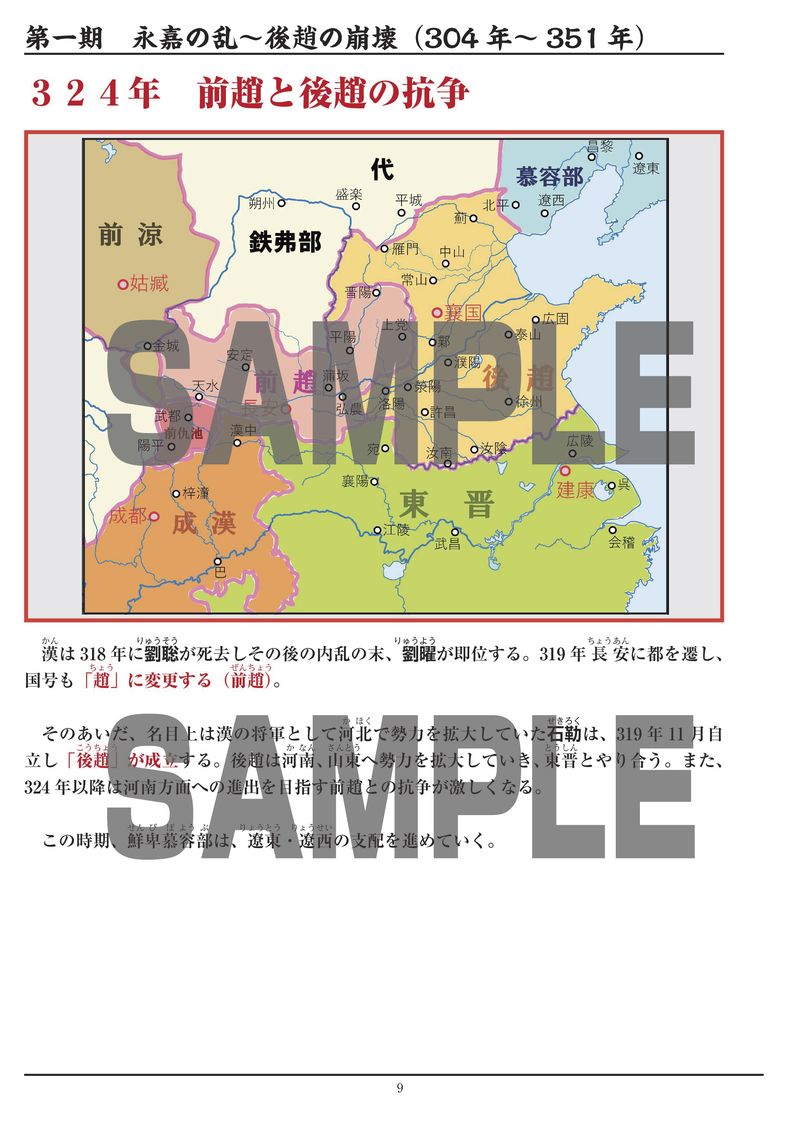 中国史上、三国志を超える戦乱の時代「五胡十六国時代」の勢力地図集です。五胡十六国時代【304年~439年】までの、勢力地図30図を解説文とともに掲載しています。(290年と300年頃の地図2点も含む) 五胡十六国時代を3期に分け、それぞれの期で古い順に、勢力範囲の動きがある時期の勢力地図を掲載しています。地図は、勢力を色分けして区別がしやすくし、河川や主要都市名なども入れています。 短期間で、国や勢力範囲が入れ替わる複雑な時代を地図を使用し、なるべくわかりやすく解説しています。 付録ページとして、五胡十六国時代全土の各エリア名地図を等高線入の地形マップとして入れていますので、解説文に出てくる「河南」「河東」「オルドス(河套)」「隴右」などのエリアがどこになるかもわかりやすくしています。【SAMPLE】 *クリックすると別ウィンドウで拡大表示します。
