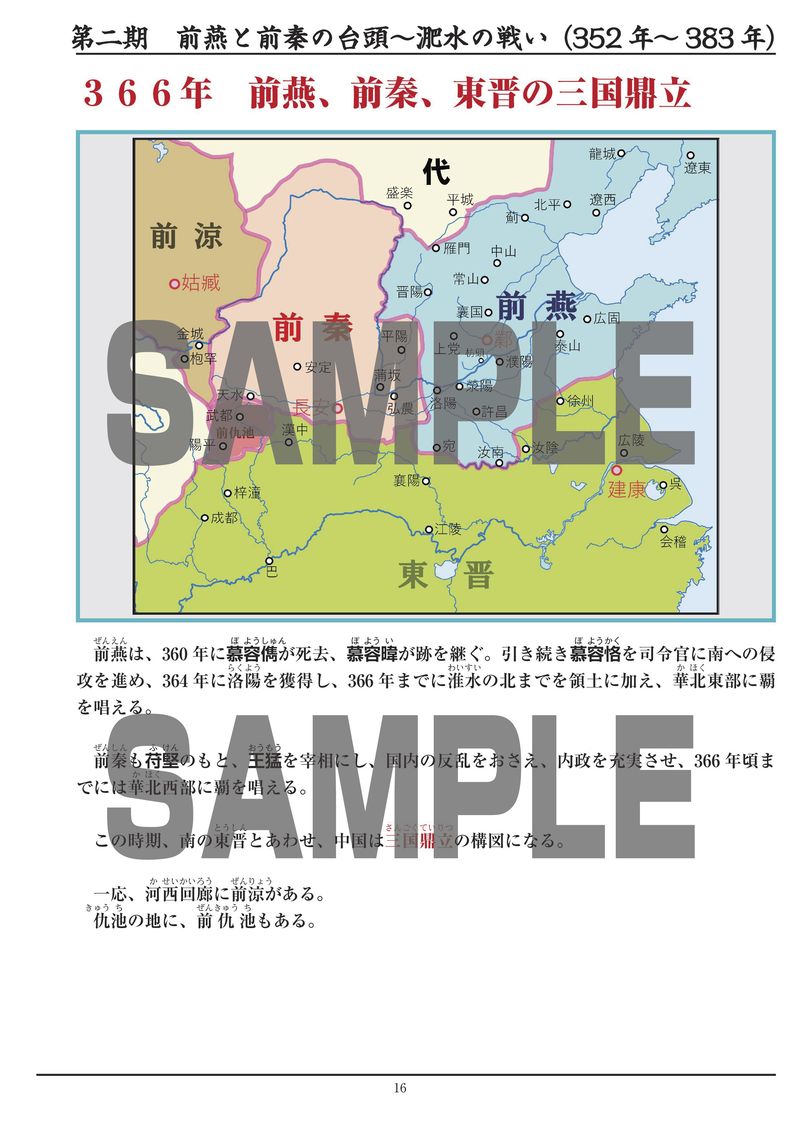 目次: 五胡十六国時代 勢力表 序 五胡十六国時代前夜 290年 晋の天下 300年頃 胡族の分布図 第一期 永嘉の乱~後趙の崩壊(304年~351年) 306年 五胡十六国時代の幕開け 308年 漢の侵攻 316年 西晋の滅亡 324年 前趙と後趙の抗争 329年 後趙の覇権 337年 石勒死後の後趙と、前燕の建国 349年 後趙の各地への対外戦争と国内の混乱 第二期 前燕と前秦の台頭~淝水の戦い(352年~383年) 352年 後趙滅亡後の華北の分裂 357年 前燕と前秦の勢力拡大 366年 前燕、前秦、東晋の三国鼎立 370年 前燕の滅亡 376年 前秦の華北統一 383年 「淝水の戦い」 第三期 前秦の崩壊~北魏の華北統一(383年~439年) 383年~385年 「淝水の戦い」後の前秦の崩壊と、各勢力の自立 385年 前秦崩壊後の群雄割拠 390年 苻堅の死と、後秦、後燕の勢力拡大 394年 慕容垂無双 396年 「参合陂の戦い」と、北魏の南侵 399年 北魏の中原支配と、燕の分裂 407年 後秦の河南侵攻と、河西エリアの分裂 410年 西秦の復活と、涼国家の抗争 415年 夏・赫連勃勃の勢力拡大と、南涼の滅亡 417年 東晋・劉裕の北伐と、後秦の滅亡 418年 夏の関中強奪 423年 宋の建国と、北涼の河西回廊統一 429年 北魏の華北西部への侵攻 436年 北魏の大攻勢 439年 北涼の滅亡と、北魏の華北統一(五胡十六国時代の終焉) 付録 五胡十六国時代全土の各エリア名地図 おわりに・参考文献