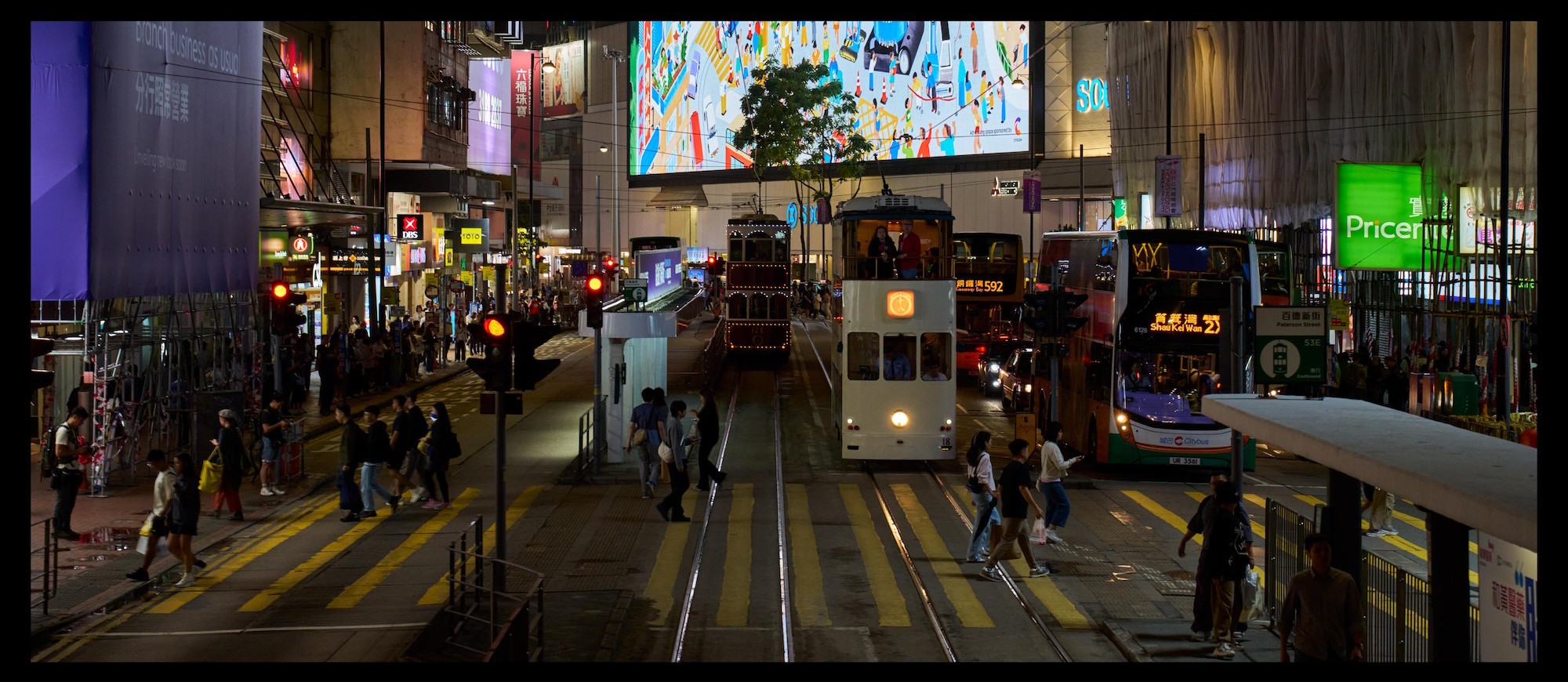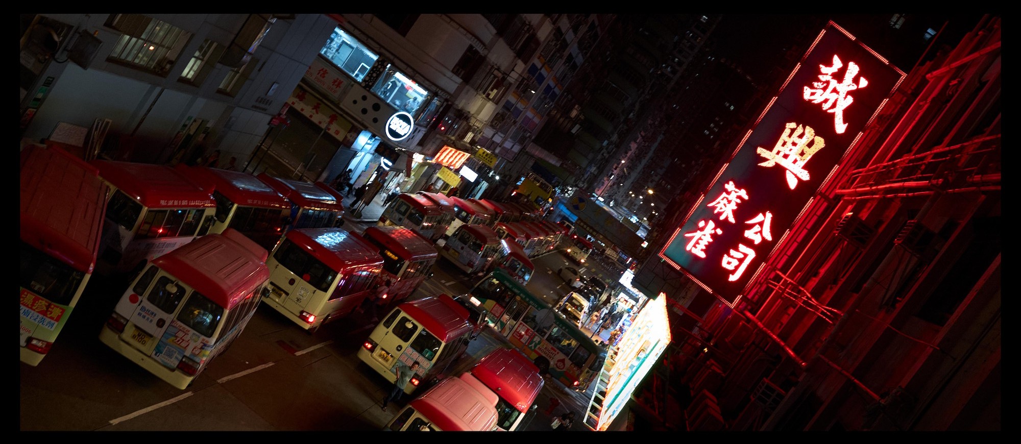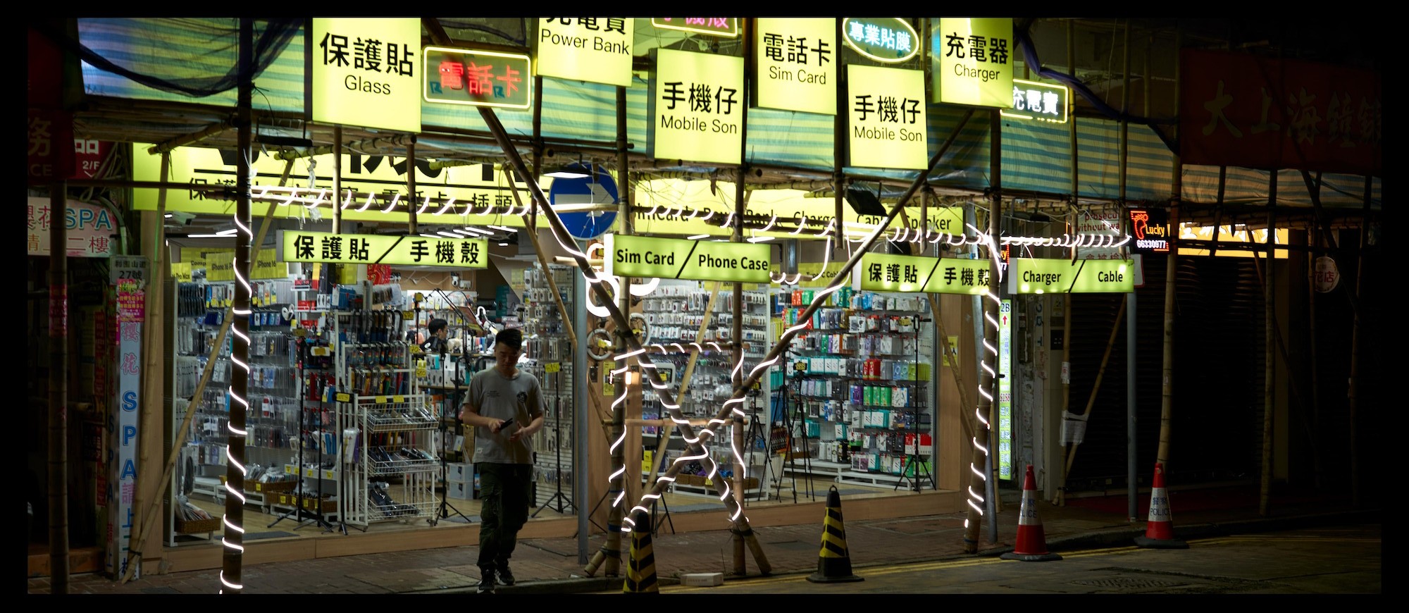 映画のスクリーンのような横長の構図で切り取られた街の情景が、 観光写真とは少しちがう視点と距離感から、いまの香港の夜の街角を見せてくれます。