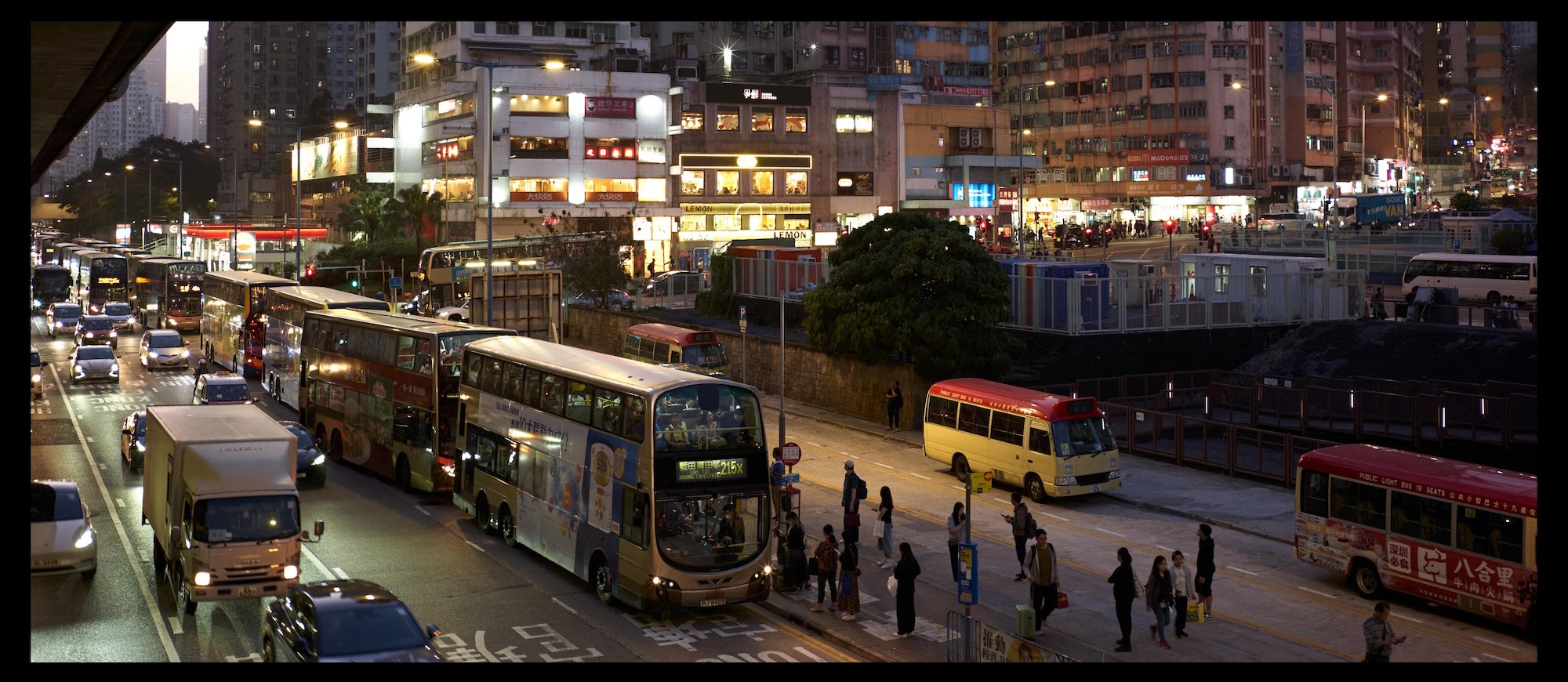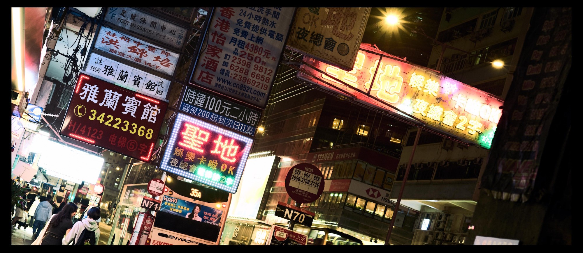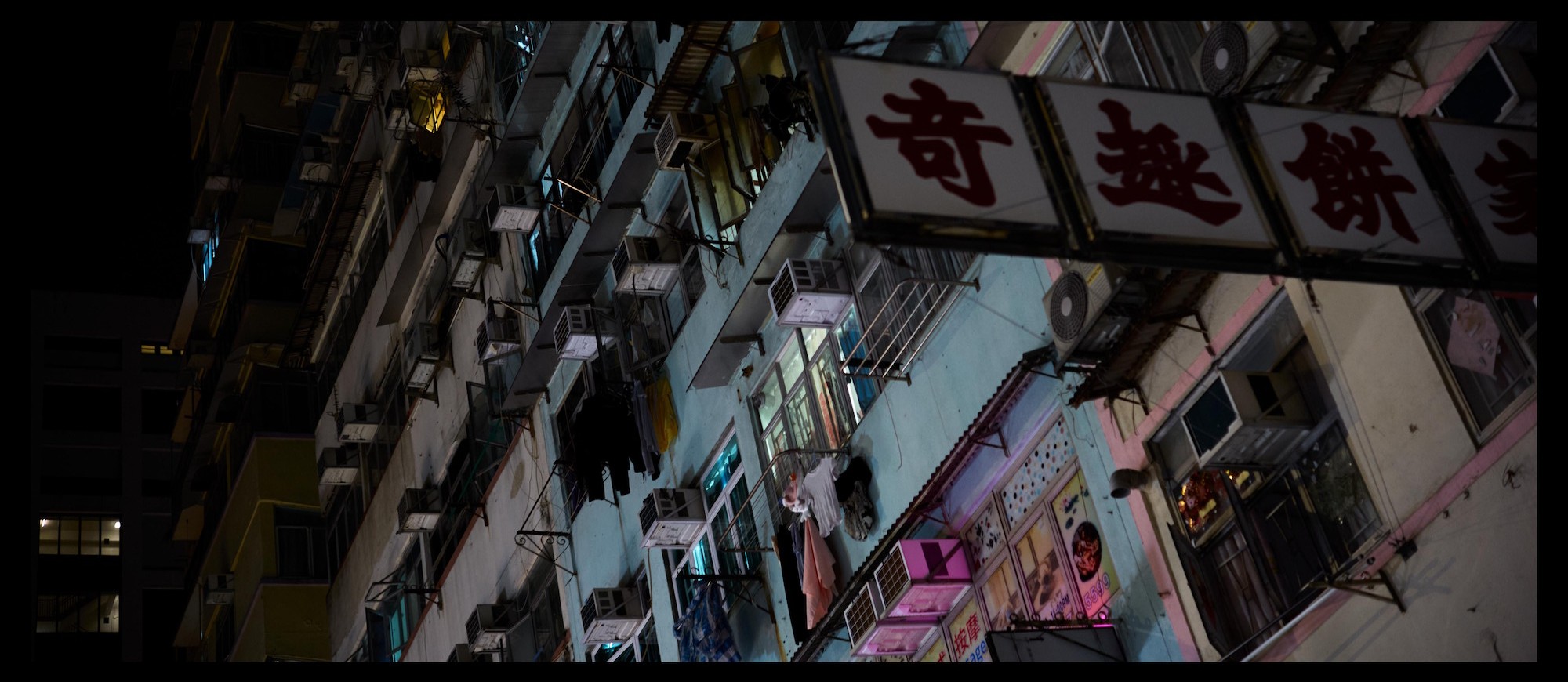 映画のスクリーンのような横長の構図で切り取られた街の情景が、 観光写真とは少しちがう視点と距離感から、いまの香港の夜の街角を見せてくれます。