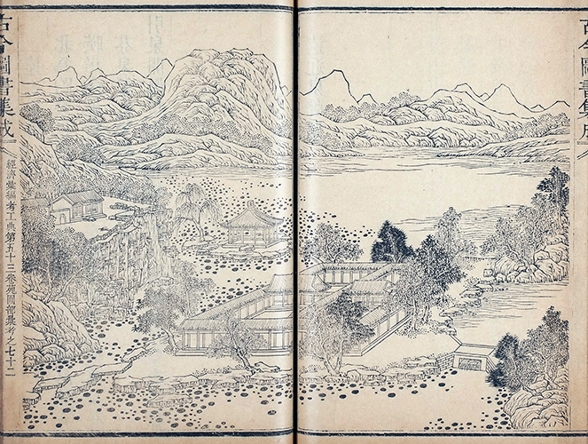『欽定古今図書集成』とは康熙帝の時代に企画された中国最大の百科事典で(これを類書という)、その巻数一万巻。勅版である。明の三才図会や永楽大典の規模の大きなものと考えればいいか。古今のあらゆる書物から抜き出した記事を配列して並べた膨大なものだという。私も実物の全体は見たことがない。かつて国会図書館に影印本が配置されていたことがあった。もとは『彙編』と呼んだが康煕帝は『欽定古今図書集成』と名を改めた。さらに雍正時代に増訂して、雍正3年(1725)に完成した。 驚いたことに本文は銅活字を用いて作られている(普通は整版で彫るが、これはわざわざ銅製の活字を鋳造している)。図版は木版だ。その図版はいずれも精緻の極を行くものだが、藝術性にはやや乏しいと言われる。日本にも享保時代に輸入されている。西崖は『欽定古今図書集成』が重刻した「避暑山荘」の優れた図版を採用して(『避暑山荘三十六景図詩』は康煕年間の刊行で、『古今図書集成』は雍正年間刊行だから、図版は前者を踏襲している。結果において西崖の『熱河三十六景詩図』は重重刻になる)、多少の加工をした上で自らの「図本叢刊」シリーズに加えたのである。題して『熱河三十六景詩図』。ここで『避暑山荘』の名を避けたのは、図版の出自が異なり体裁も多少変えたことによるからだろう。そのもとにした『欽定古今図書集成』の原刻本は、どこでどうしたのか。実は先日偶然に、ネット検索中に京都大学人文科学研究所に三冊だけ、『欽定古今図書集成』の零本が収蔵・公開されているのを知った(これそのものを西崖が使ったかどうかは判らない)。「欽定古今圖書集成 殘三卷 存山川典卷第二十三第二十四考工典卷第五十三 有闕葉 淸康煕中敕撰 活字印本」とあるのがそれで、ネットで図版を一見したがまさに西崖が用いたと考えられる「図版部分」が含まれている。その出来栄えと康煕版の仕上がりについて比較してみると、一長一短で、西崖の意見にそのまま同意するのはなかなか難しい。文人画を尊崇する西崖の「好み」は分かるが、康煕時代の『避暑山荘』殿版の挿図にもそれなりの味わいがあると思う。ただ、『欽定古今図書集成』の図版はどちらかといえば日本人好み、浮世絵のタッチをも思わせるものがある。