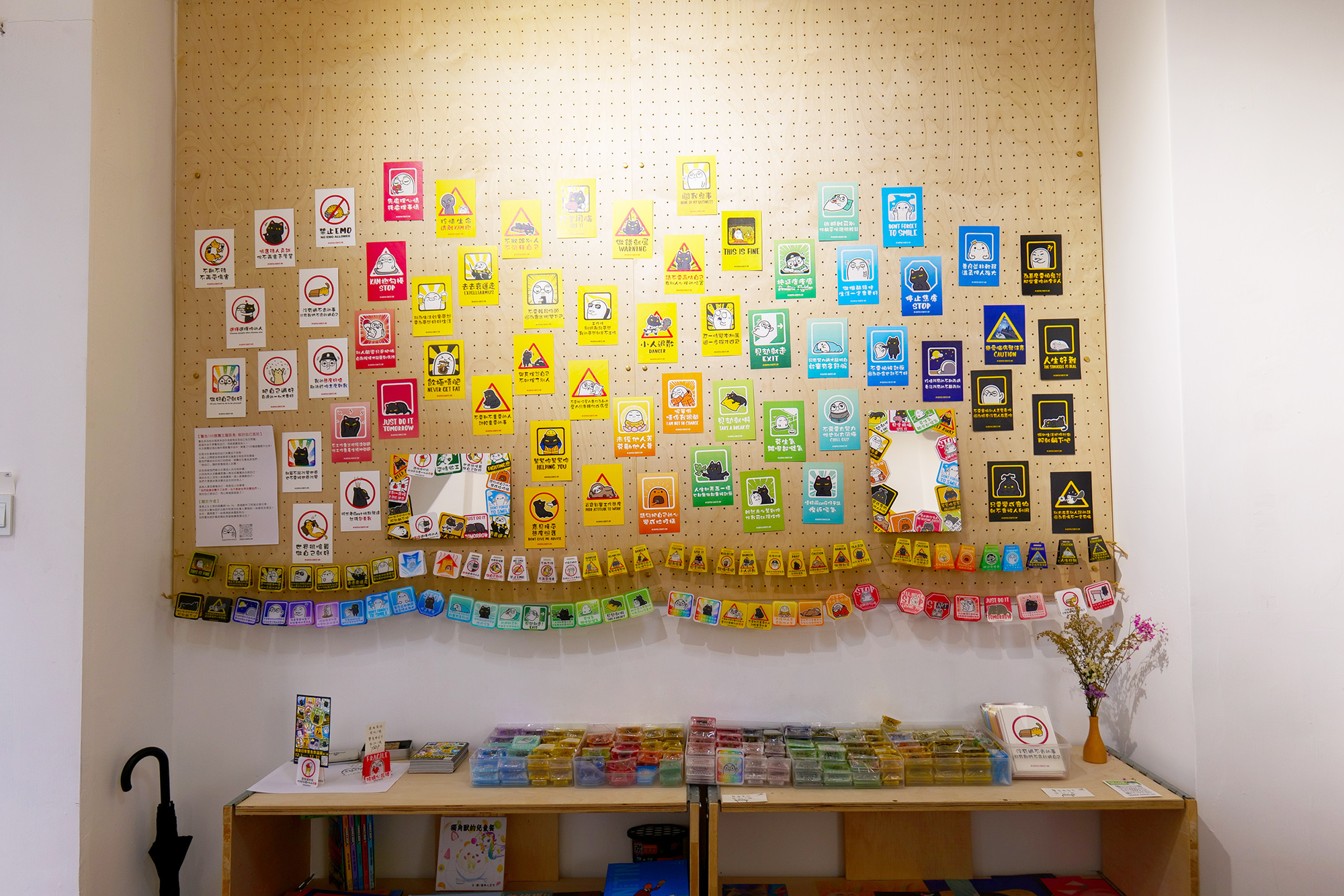 店内に入って左側の壁には地元アーティストの作品・グッズが展示され、販売もされている。