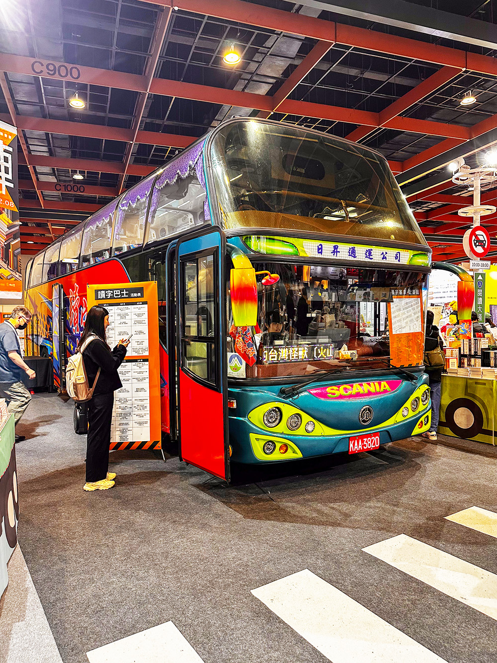 香港の官製ブックフェアも各ブースは独自色を出そうと努力しているが、台北のその自由度は次元が異なる。中でも異彩を放っていたのが「讀字塞車」のブース……いや、ブースというより広場というべきか。なんと本物の大型観光バスやトラックが鎮座していたのだ。