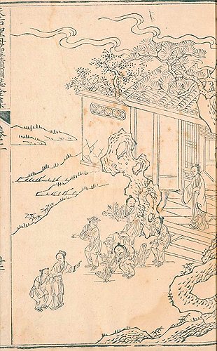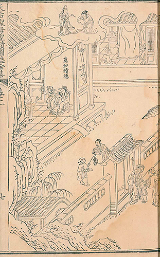 次の図は「遇道人秘傳玄訣」と題されている。「道人」とは道教を修めた偉い先生とでもいえばよいだろうか。部屋の中央にでんと座っているのが道人で(偉い人なので大きく描かれている)、その前に腰をかがめているのが若き日の媽祖だろう。庭には大きな池があって、太湖石が見える。立派な松も枝を張っている。回廊には使用人がいて部屋の中を窺っている。手前の若者は何かを運んでいるらしい。道人は書物を開いて、媽祖と何か会話を交わしているようだが、それこそ「奥義」を伝授しているのかもしれない。後ろからは小間使いが二人覗いている。