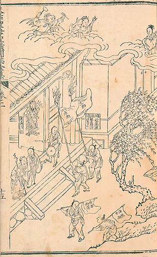 上の場面は出産の行われている部屋を描き、手前の室内で談話しているのは、父親・林氏とその父親らしい(媽祖の祖父か)。そこに「莫如積徳」(徳を積むに如かず)とあるのは、二人が「積徳」の功を話しているのだろう。場面は夜だが、それは「林府」と書かれた提灯を下げた子供が描かれているので分かる。表門には出産を祝う人が駆けつけているようだ。連れてきた子供もきちんと描かれている。夜間風景は普通民間版画では、黒く描かない。第一に面倒だし、輪郭線を白く浮きだたせたりして、煩雑な作業になり、仕上がりからは内容がよく分からない。だから一種の約束で、その場面に提灯などを描き加えているのだ。
