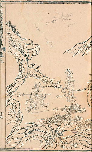 この画の表題は「感大士賜丸得孕」である。「丸」は丸薬のことだ。図は媽祖の誕生シーンだ。「大士」は観音のことで、夢で観音に丸薬をもらい服したところ、子供を授かったという。「丸」は版本では「凡」に近い形に彫られているので、間違えやすい。しかし意味から考えれば「点は中ではなく、左のはらいにつく」のである。